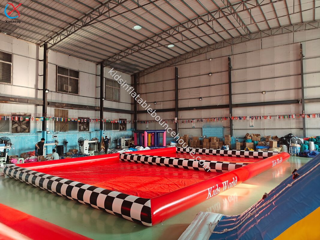 屋外の商業利用向けに設計された赤いインフレータブルバブルプール。耐久性のある構造と鮮やかなデザインが特徴です。