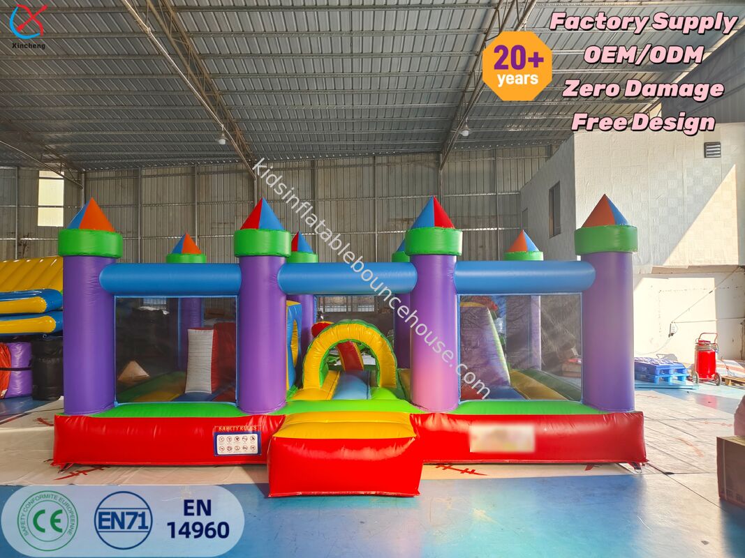 この彩虹色の充気式跳ね返し屋の城は 障害物コースとスライドを備えた 多塔式デザインで 継続的なアクティブゲームと娯楽を可能にします