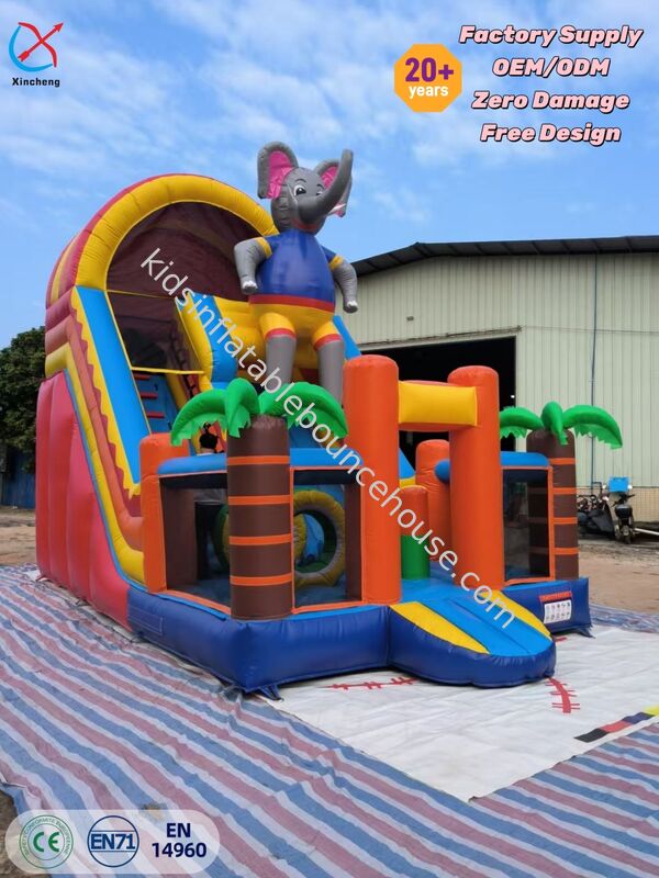このエキサイティングな象をテーマにしたインフレータブルバウンスハウスは、鮮やかなグラフィックとスライド障害物のデザインを備えており、子供たちに没入感のある遊び体験を提供します。頑丈な構造により、パーティーやイベントでの安全なバウンスとスライドの楽しさが保証されます。